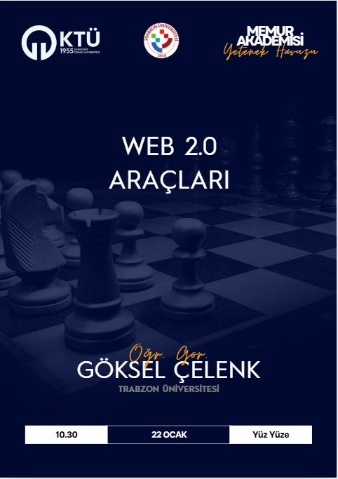 Karadeniz Teknik Üniversitesi Memur Akademisi Birimi ve Trabzon Üniversitesi iş birliği kapsamında, Kariyer Geliştirme Uygulama ve Araştırma Merkezi Müdür Yardımcısı Öğr. Gör. Göksel ÇELENK tarafından tüm personelimize yönelik “Web 2.0 Araçları” konulu eğitim programı, 22.01.2026 tarihinde saat 10.30’da KTÜ Fen Fakültesi Nazım Terzioğlu Amfisinde düzenlenecektir.